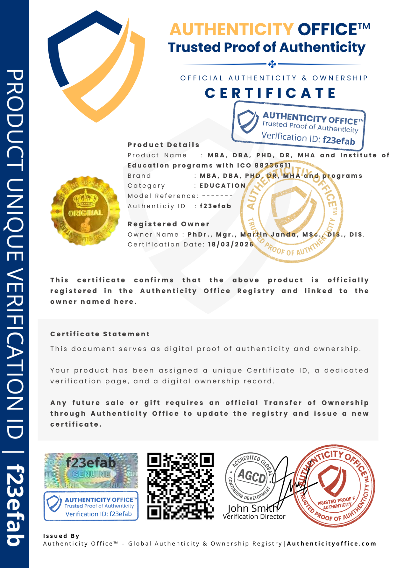 Kromě toho AGCD ověřuje všechny dokumenty vydané společnostmi Sigma Holdings, Youview London University UK, Golden International Awards, International Experts Register (IER), Accreditations.us, IHEAC, The World Alliance Chamber of Innovative Organizations (WACIO), stejně jako jakýkoli dokument nesoucí náš oficiální QR kód a certifikované razítko, čímž zaručuje autentičnost, legitimitu a mezinárodní důvěru.