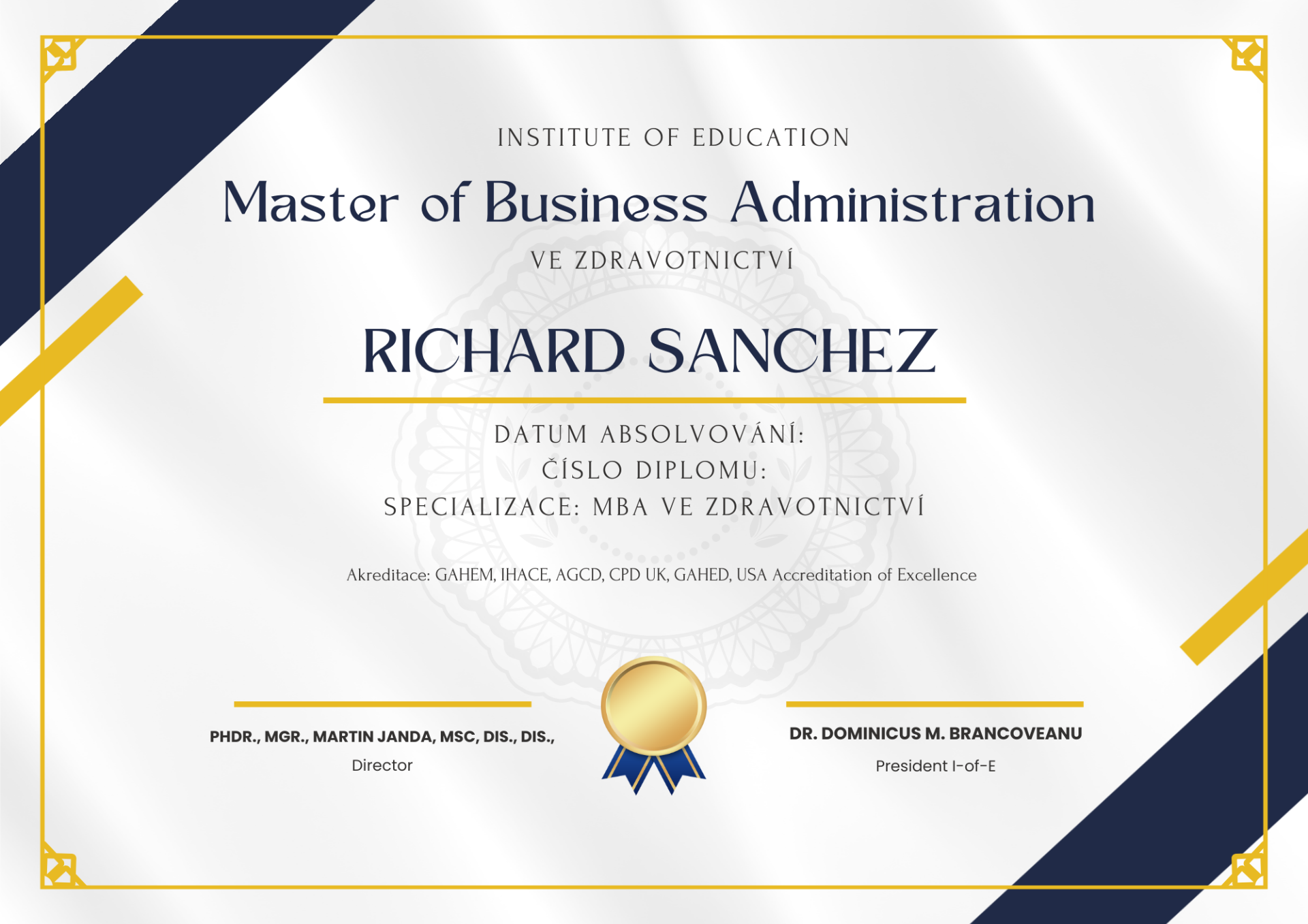 - PhD (Philosophiae Doctor) jedná se o nejvyšší profesní titul v rámci akreditace GAHE/IHEAC. Tento titul je populární v rámci expertní praxe, managementu a byznysu. Držitel titulu je expertem na metodologii řešení složitého managementu a výzkumu.